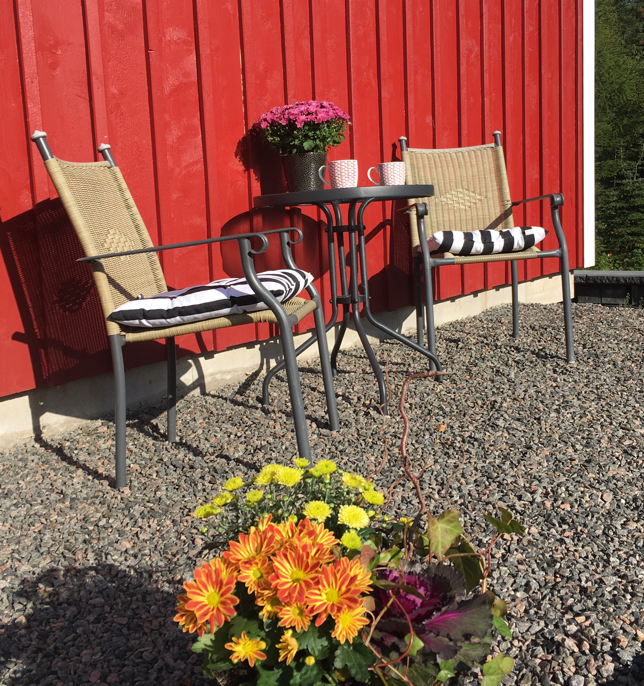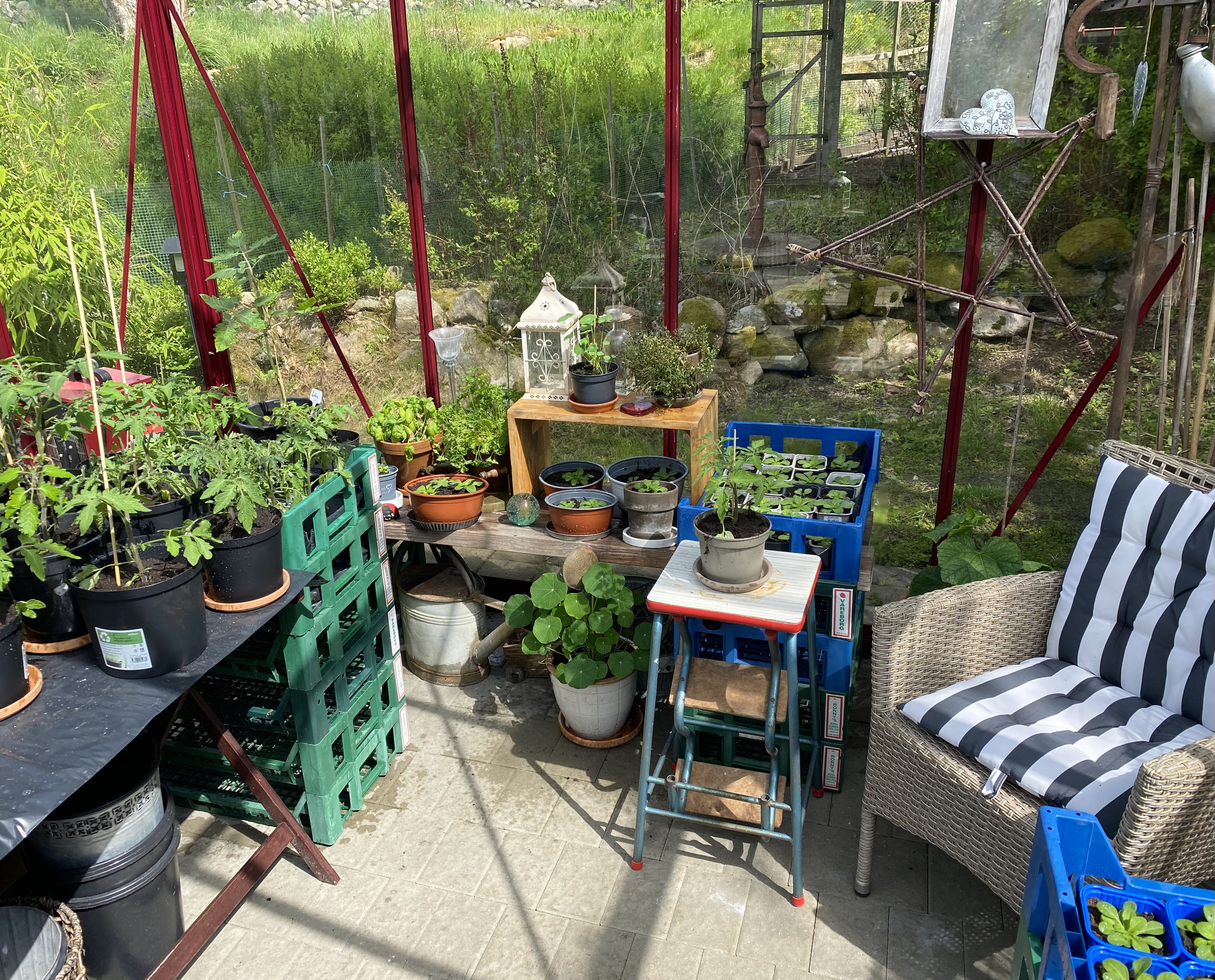 Det är dags att så små frön som ska bli stora tomatplantor eller blommor. Vi har röjt ut växthuset på allt ”bröte” som samlat sig där under höst och vinter. Nu ska det möbleras efter odling. Så klart måste det finnas en liten hörna där jag kan sitta och se när allt växer och gror. Dricka kaffe (eller vin) och bara njuta av mina växter.