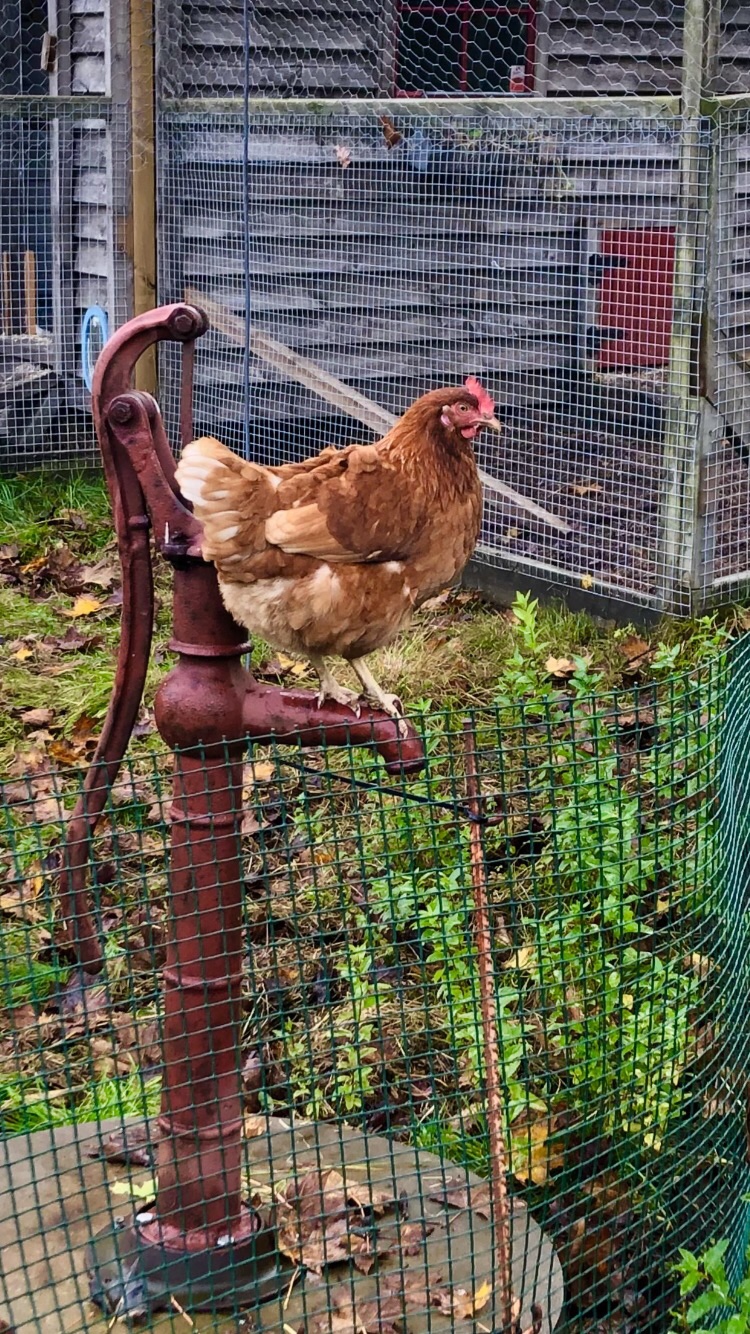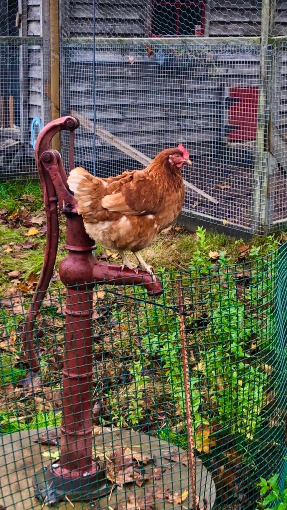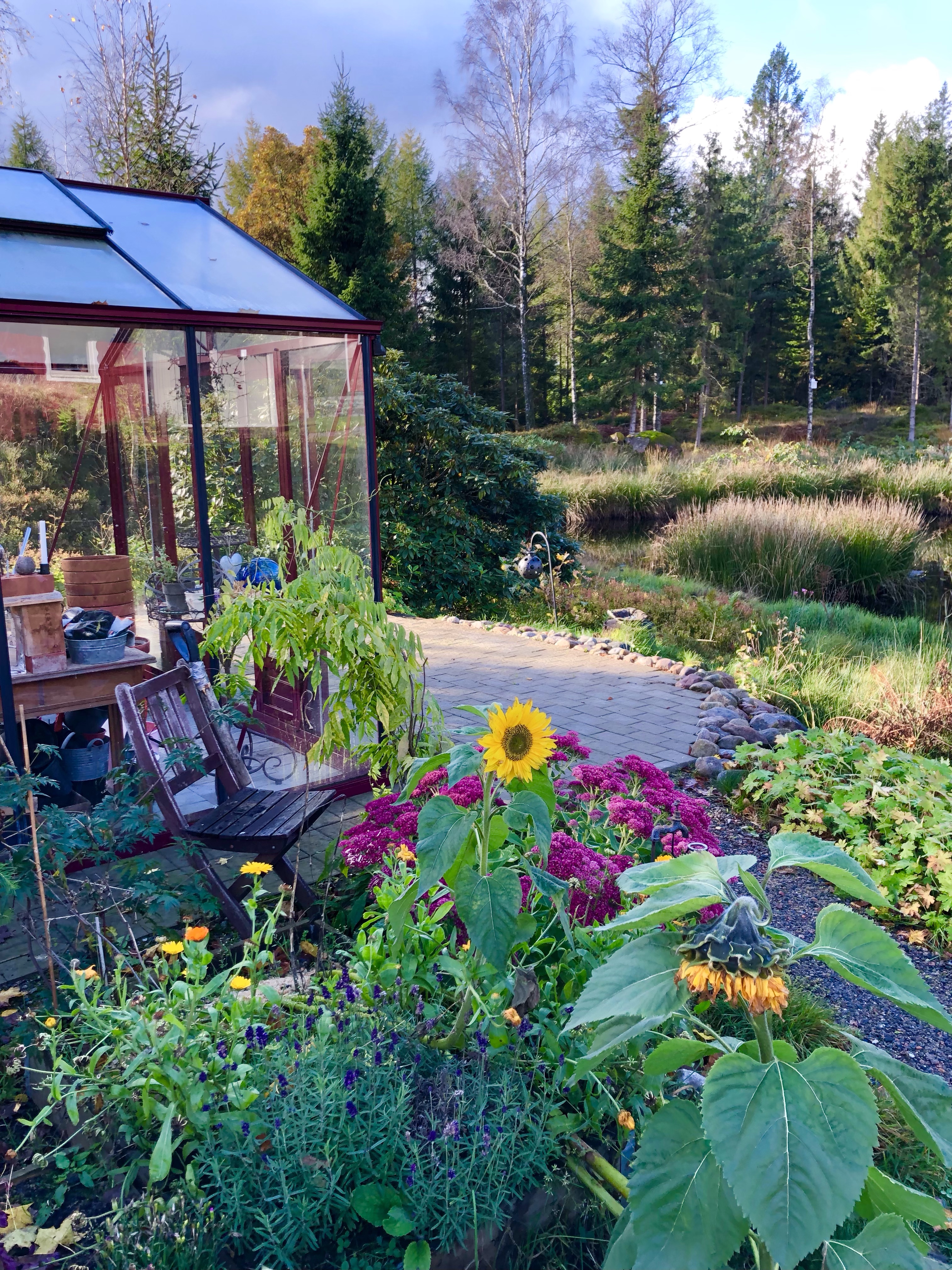 Vi har haft härligt fina höstdagar. Frost på morgonen och sedan under dagen riktigt varmt och soligt. I växthuset bor nu (tillfälligt) våra små höns, de som vi kläckt fram här. Det är tuppen (Dick) och tre eller två hönor. Vår lille ”plutt” har nu vuxit till sig och blivit väldigt mycket större och kaxig! Vi vet faktiskt inte om det är en höna eller en tupp.