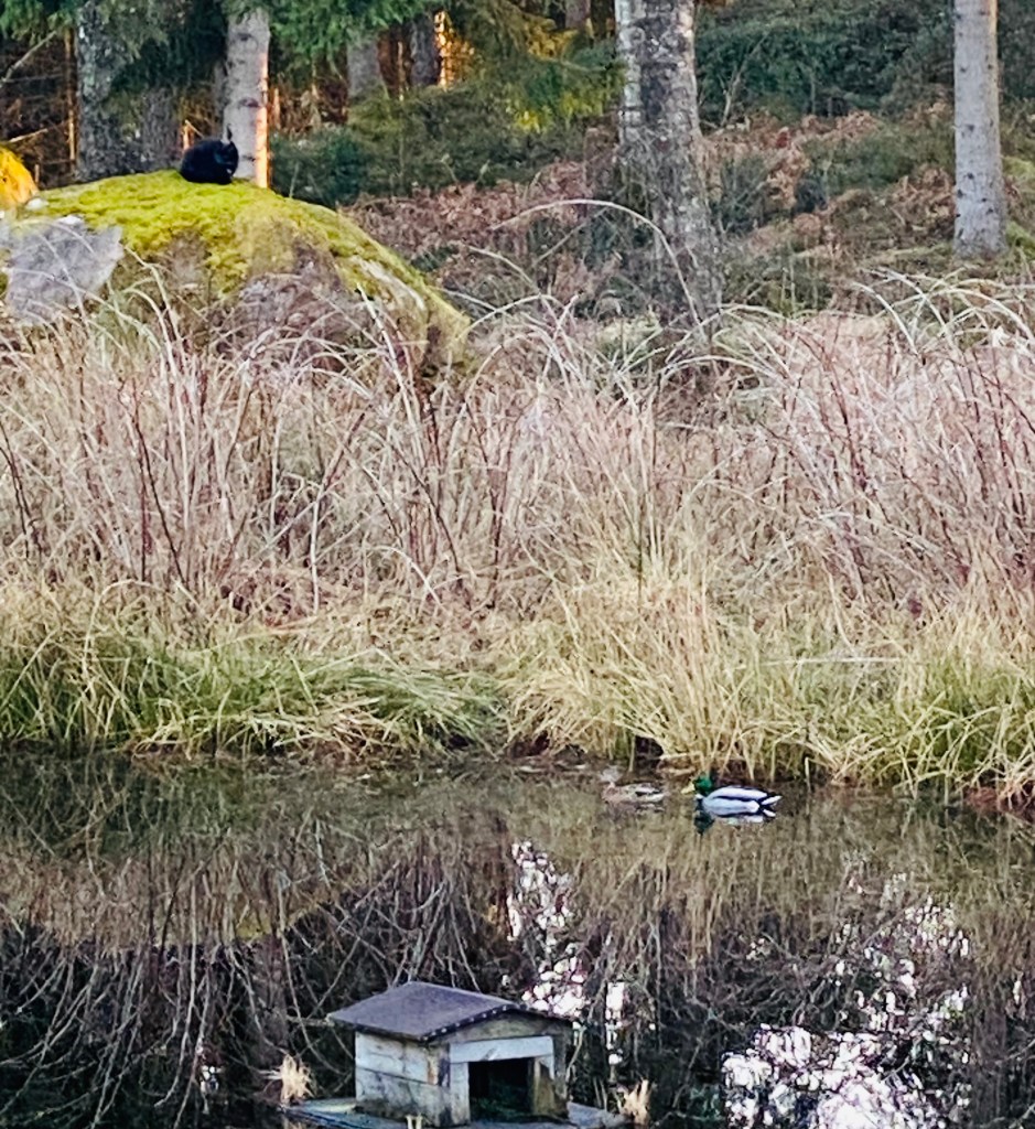 Vi älskar djur. 🩷 Svante älskar att ”fågelskåda” på alla fåglar som landar i dammen ……. ofta nöjer han sig inte med det, utan han måste smaka lite också, men dessa stora änder går han inte på. Katterna gillar inte heller när vi har hundar som gäster i stugan. Då håller de sig gärna undan och tittar på dem på avstånd. Just nu har vi besök av en cool hund som heter Troll.