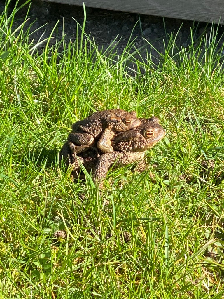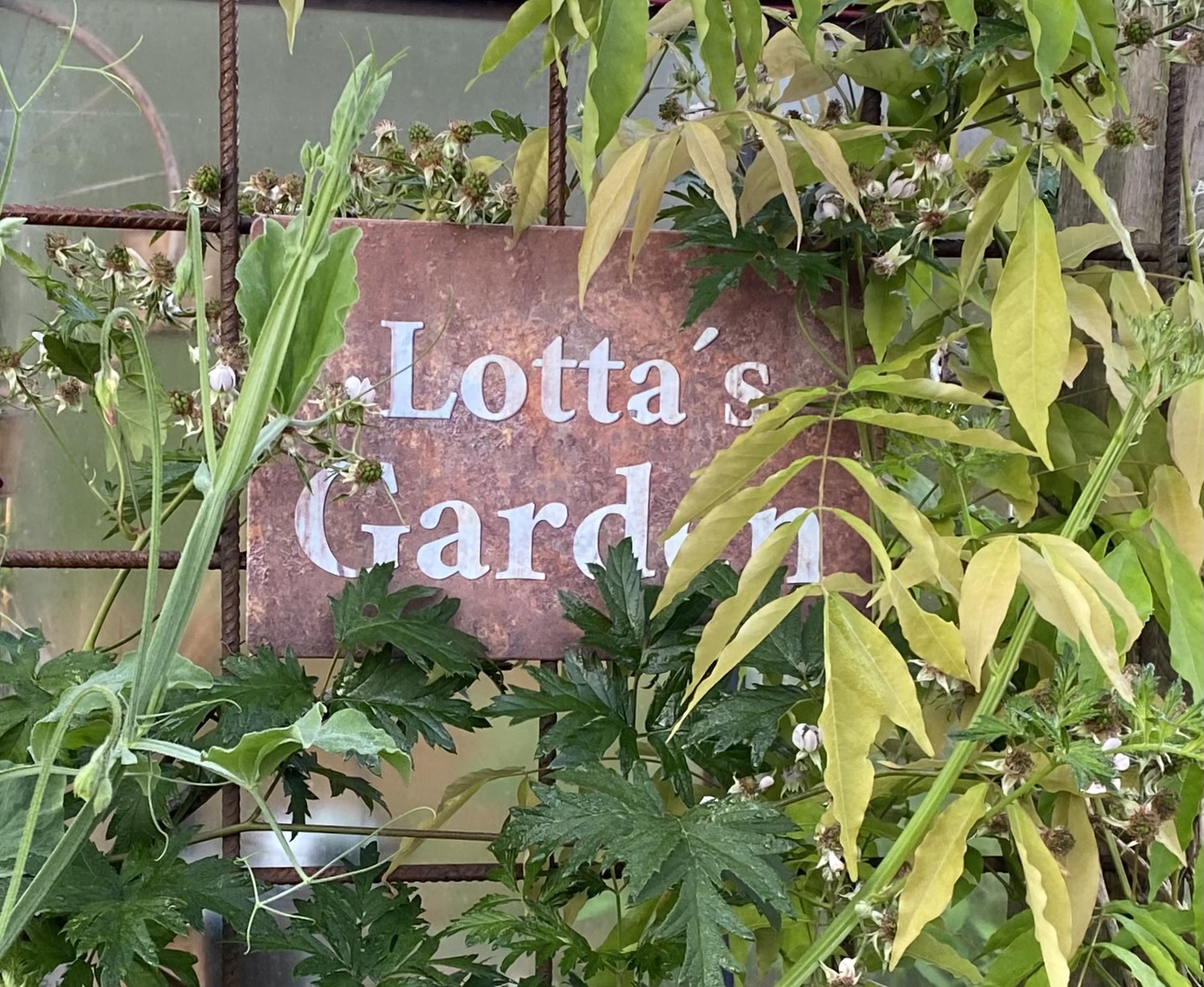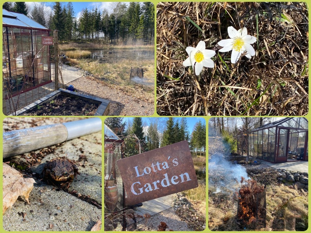 Idag fick jag en fin skylt. ”Lottas garden”, blev så glad för den och den passar så bra på på nätet som björnbärsbusken klättrar på. Vårens första små vitsippor hade också vågat sig fram precis som en groda som hoppade ut på plattorna framför mig. Den skulle säkert ner till dammen på poolparty. 🥳