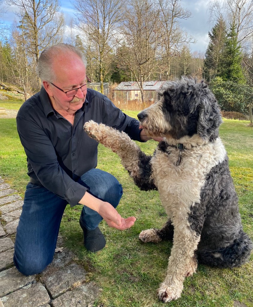 Här har vi honom – Troll! Ronnys stora kompis från Schleswig – Holstein, som bor hos oss nu med sin husse och matte. (Det var dem jag fick den fina skylten av idag). Troll är en labradoodle och han är mäktig! För några dagar sedan hade Ronnys son och en granne till oss sett stora tassavtryck i vägen och undrat vad ”tusan” detta kan vara? Lodjur? Varg? Björn? Jag vet, sa Ronny – det är Troll!
