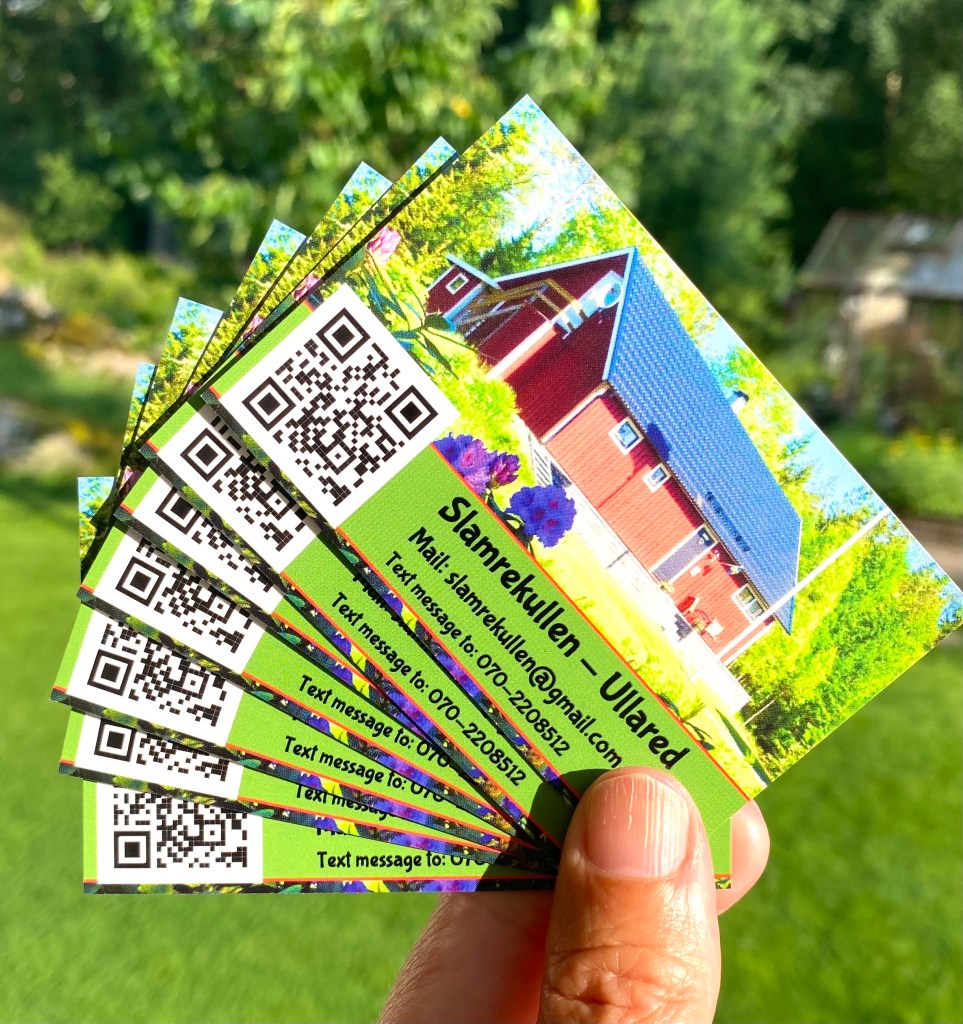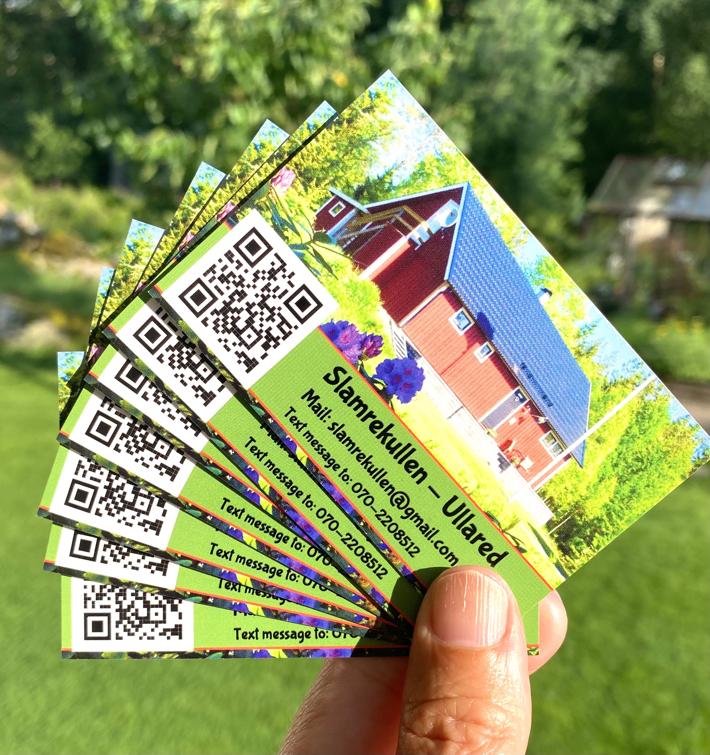 Här har vi dem! Har inte ändrat så mycket på designen, Bara färgen på texten, samt att vi nu har vi en fin baksida också. QR-koden gör att man kommer direkt till denna blogg, bra va? Har också pysslat lite med nya tavlor på sovloftet. Det tog nog ett år innan jag bestämde mig för att vi skulle ha dessa djurbilderna.