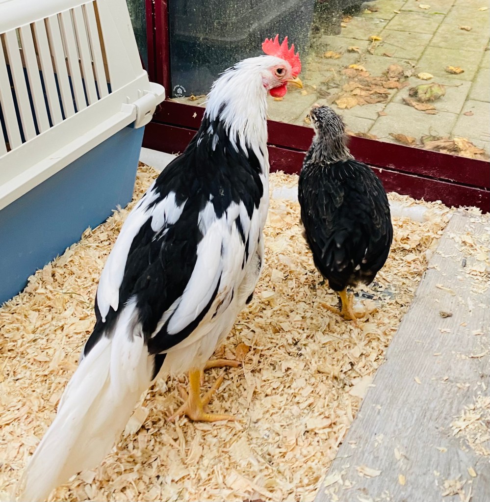 Lilla Pytte, precis nykläckt. Vad gör man om det bara blir en kyckling (av 16! ägg)? Det funderade vi över ganska länge och provade olika lösningar. En liten kyckling ska inte vara ensam, så då provade vi på att dela av en låda med ett nät. På ena sidan placerade vi två kycklingar som var 5 veckor, och på andra sidan lilla Pytte. När Pytte fick se de två andra kycklingarna skulle han in till dem. Han fastnade i nätet när han försökte trycka sig igenom. Nä, det gick inte, vi tog bort nätet och tog bort en av de större kycklingarna. Den ena, den vi tror är en höna fick gå kvar med lilla Pytte. Skulle det fungera? Och det gjorde det. Inte en enda gång vi har sett att hon varit elak eller ”pickat” på den lille. När de sover, ligger de bredvid varandra. Lille Pytte fick en snäll storasyster.
