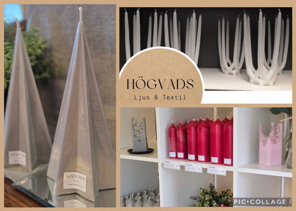 Jag måste skriva och berätta om min bästa och finaste ljusbutik. Den finns dessutom i Älvsered där jag jobbar, och det är Susanne (vår bästa vikarie) som äger butiken. Högvads ljus är en liten butik / ljusfabrik, i den gamla ICA affären i Älvsered. Så fort du kommer in genom dörren möts du av doften av stearin – så luktar riktiga ljus. Jag har tipsat flera av våra gäster att åka dit (20 km från oss) och de kommer oftast tillbaka med fulla kassar.