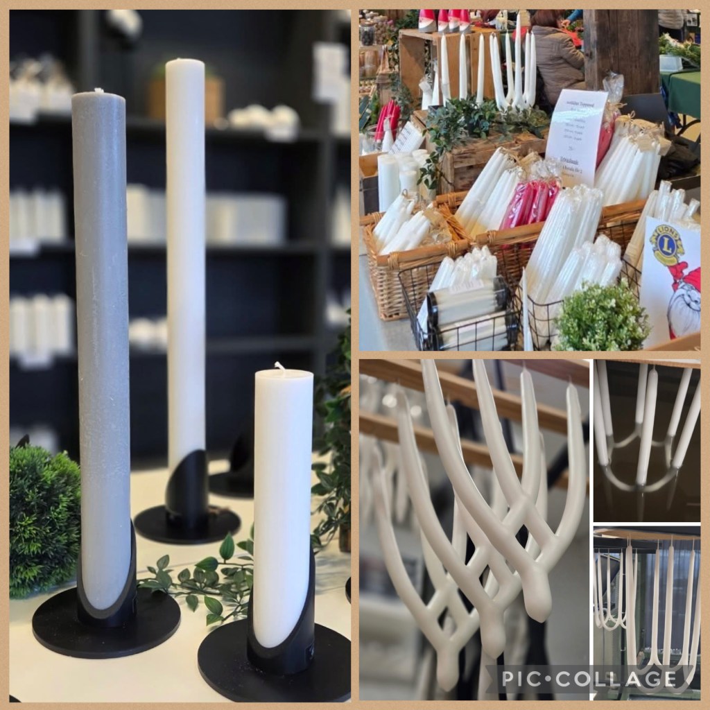 På bilderna nedan ser ni ett urval av ljus. Min favorit är de fyrkantiga, när de brinner ner bildar stearinet ett vackert nät. De långa höga ljusen (som man kan köpa samt ljusstakarna som hör till) är kyrkoljus. De är ca 60 cm långa, tunga och är jättefina. Högvads ljus levererar kyrkoljus till flera av kyrkorna i närheten.