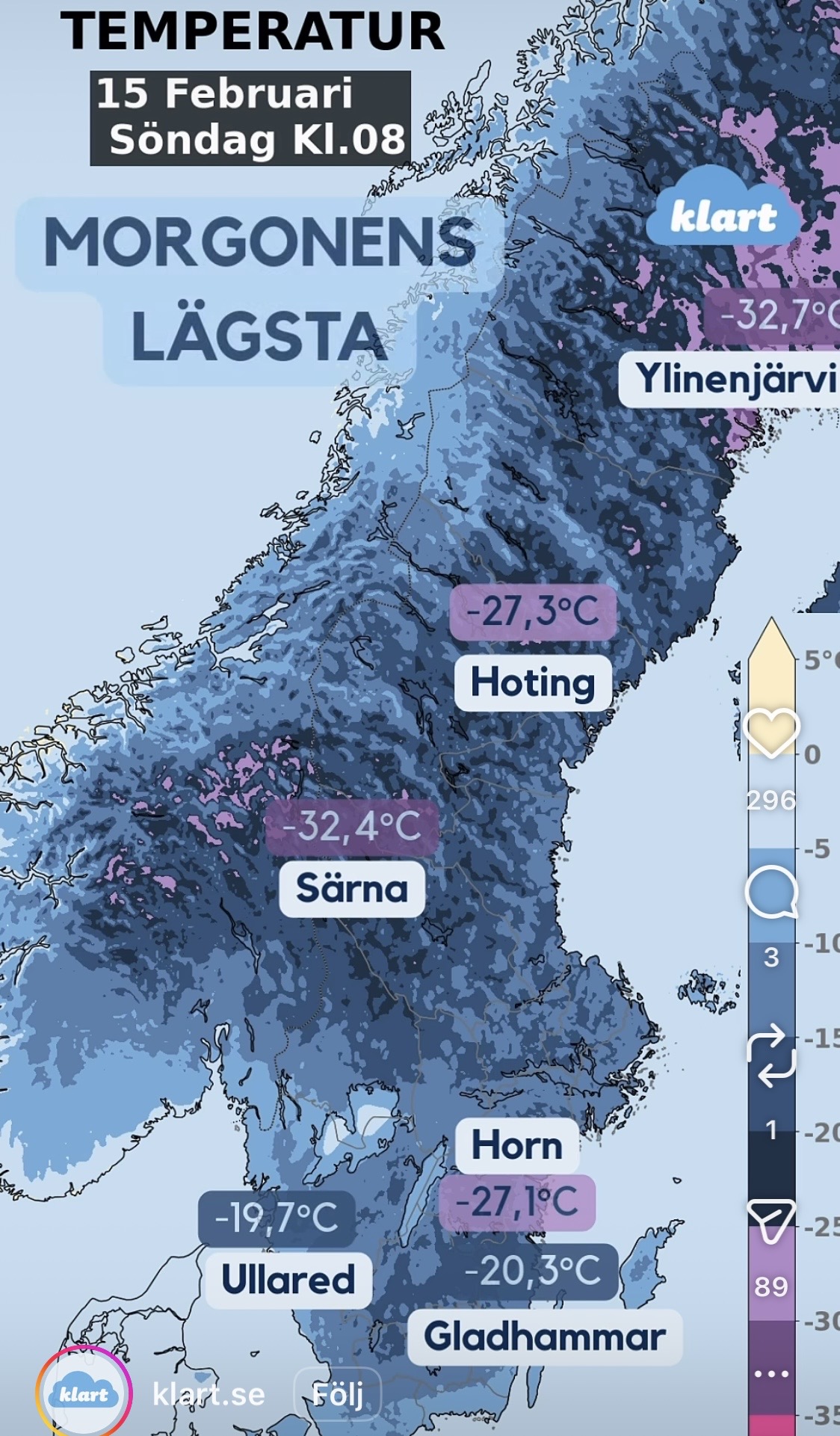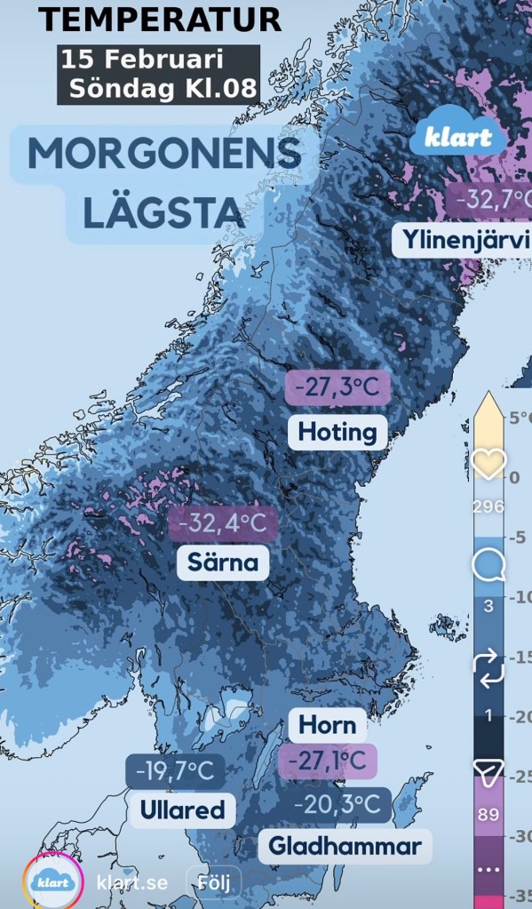 Vaknade idag och termometern stod på -17! Nu har vi haft kall vinter i snart två månader. Isen på sjön är över 30 cm tjock och personer som gillar att köra och sladda, tar sig till Sjönevadssjön och kör isrally! Visst är det härligt med en riktig vinter. Jag tror att naturen behöver det.