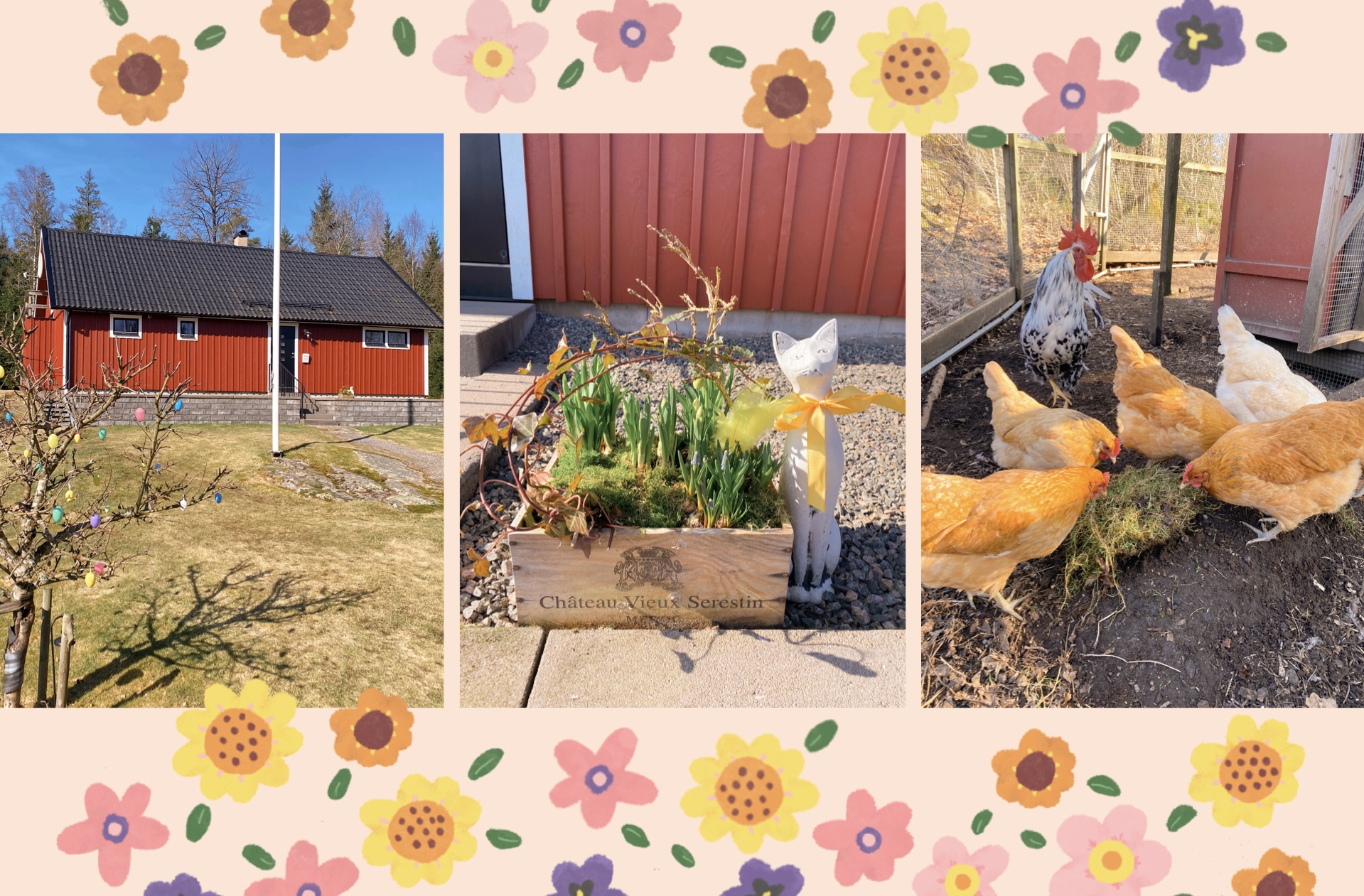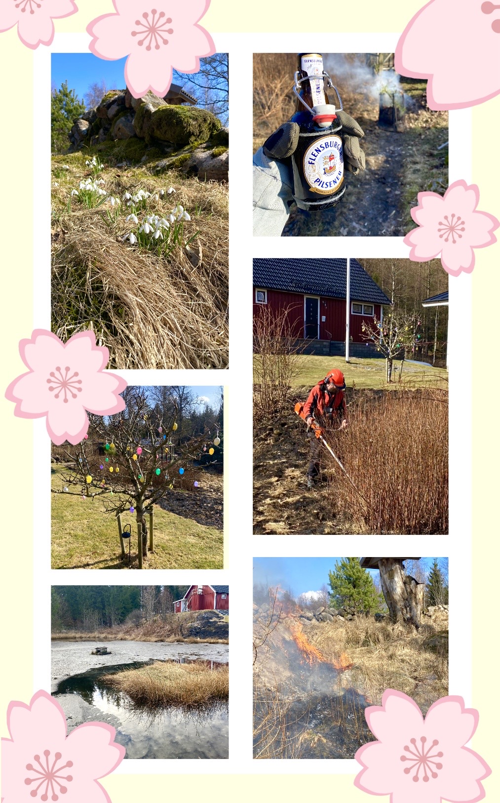 Idag (söndag) sken solen över Slamrekullen. Då kom vårkänslorna och lusten att röja, elda och pynta. Till och med hönsen fick smaka på nya späda gröna gräs och annat (vad det var, vet jag inte). När jag räfsade ihop löv, så fanns det grönska där under. Jag ville muntra upp mina små ”hönslingar” med lite gott. Jag tog en spade och gav dem flera tuvor med det gröna. De blev jätteglada! Inte ens tuppen (som i vanliga fall överlåter alla godsaker till hönsen, kunde låta bli godsakerna). Han är en riktig gentleman – Dick. Tar hand om sina sex små hönor så bra, och nu har de börjat värpa ordentligt! Vi får 6 bruna, fina ägg varje dag.