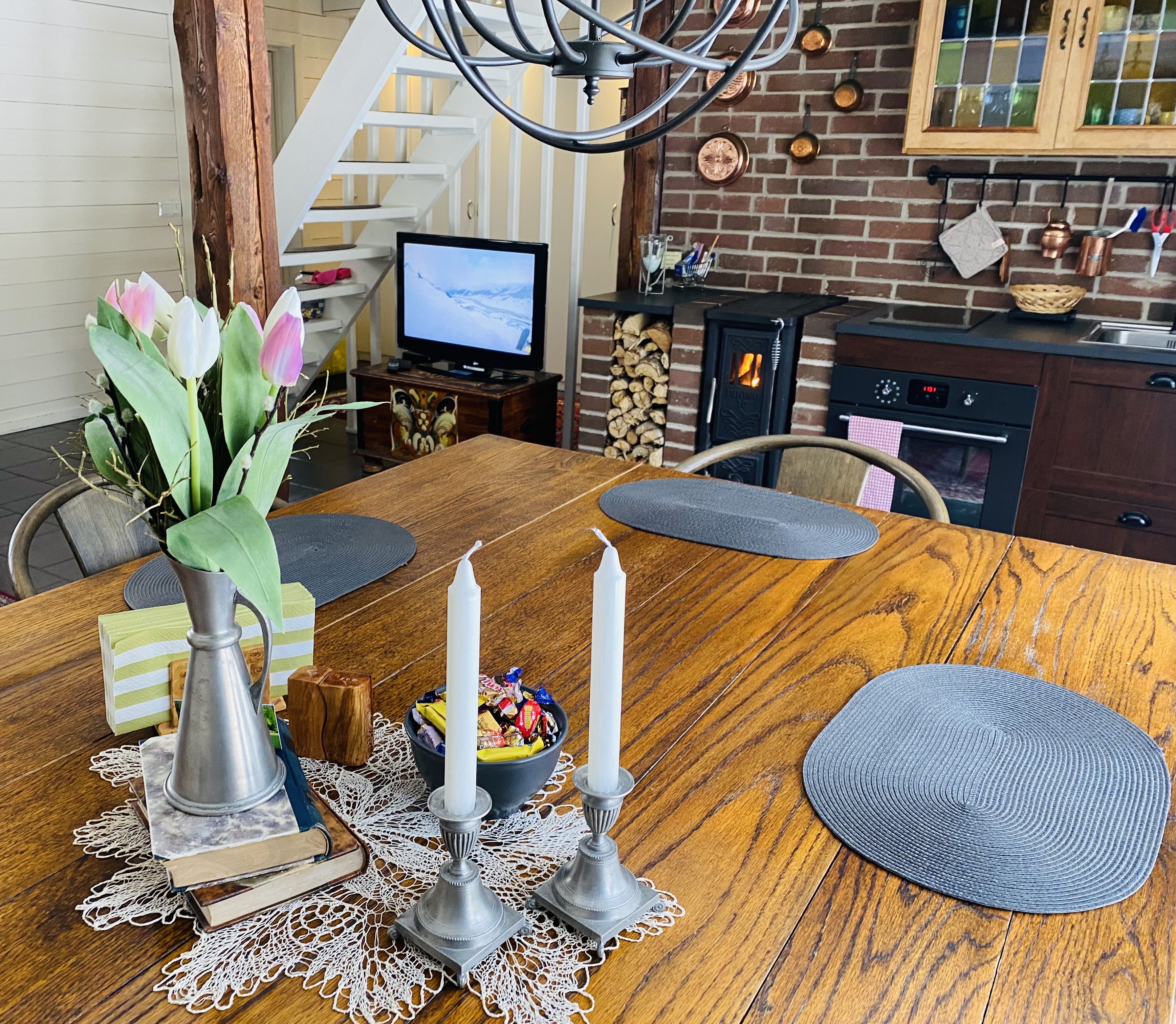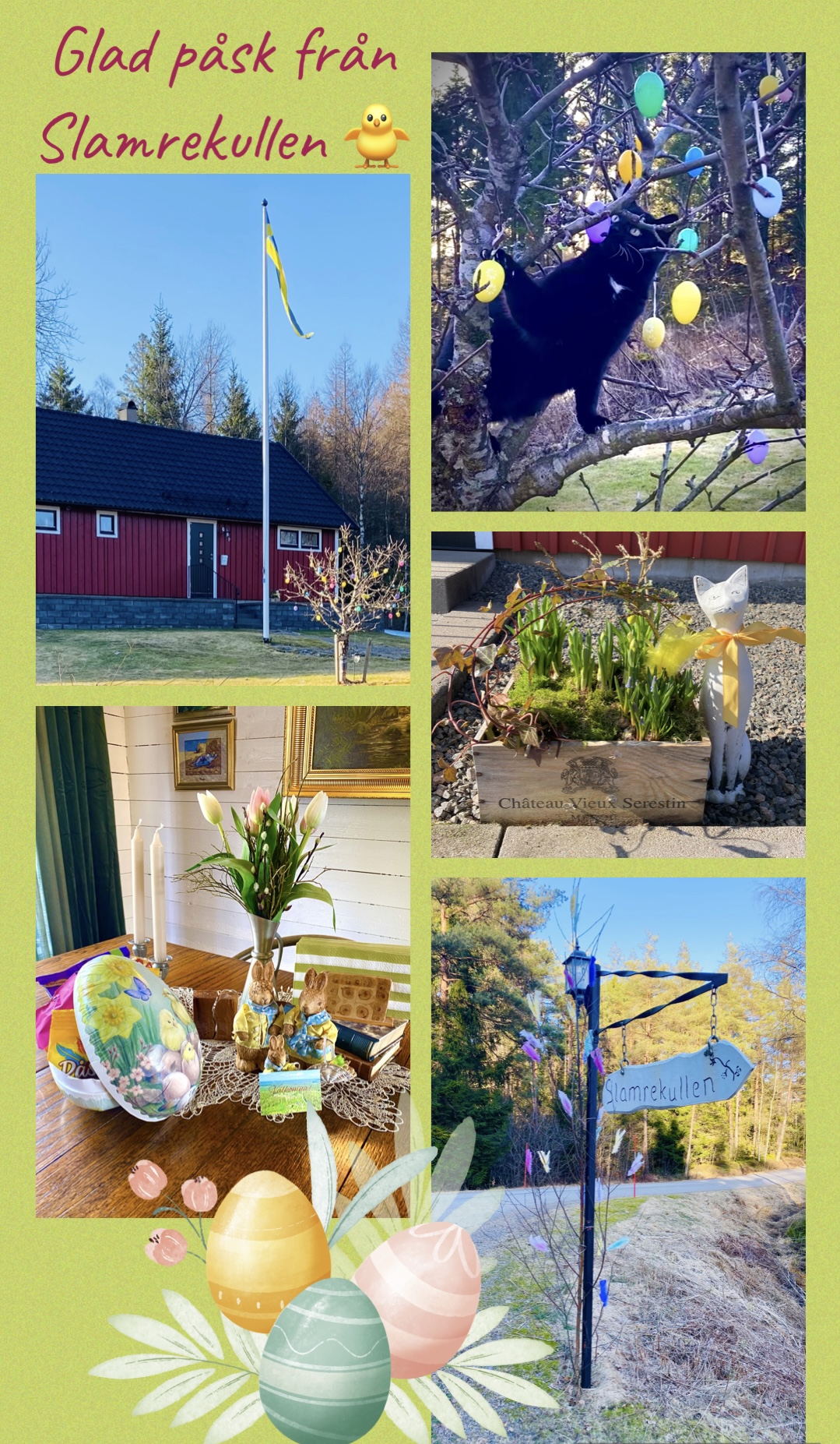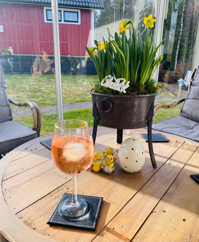 Nu är vi mitt i påsken och vi väntar på storm idag! Får se hur många av äggen i trädet som hänger kvar efteråt…. Jag gillar påsken, ljus och fin och lite ”lagom”. Lite påskliljor, några kycklingar och ägg och ett glas rosé i uterummet = Glad Påsk!