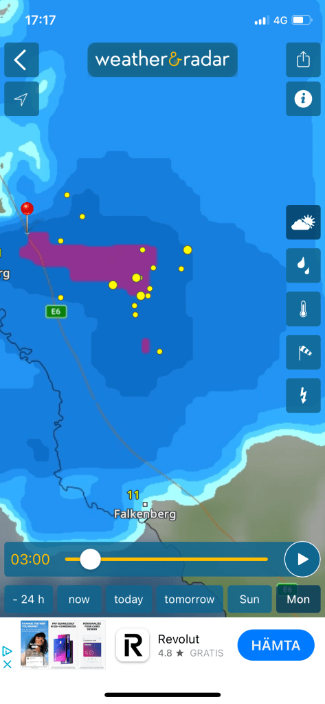 Förr, när jag bodde i Falkenberg, brydde jag mig aldrig när det åskade. Jag gick in, och väntade tills det slutade. Det var allt. Här, mitt ute i skogen, 140 m över havet, (bor på en kulle dessutom). Springer jag runt och drar ur kontakter, tittar på min nya app ”Blixtvakt” och räknar sekunder mellan blixt och dunder. Är det nära nu? Kommer det hitåt? När kan det vara över? Värst var ändå sommaren 2018. Då var det ”snustorrt” i skogen efter flera veckor utan regn. Gräsmattan var gul som en savann och i hela södra Sverige var det eldningsförbud. Hela dagen flög det brandflyg som spanade efter rök från skogen. Många varma sommardagar och på eftermiddagen / kvällen kom åskan! Precis så var det under sista veckorna i Maj och början på Juni. Vi njöt av härliga sommardagar på dagen och våndades med ”åsk-oro” på kvällen.