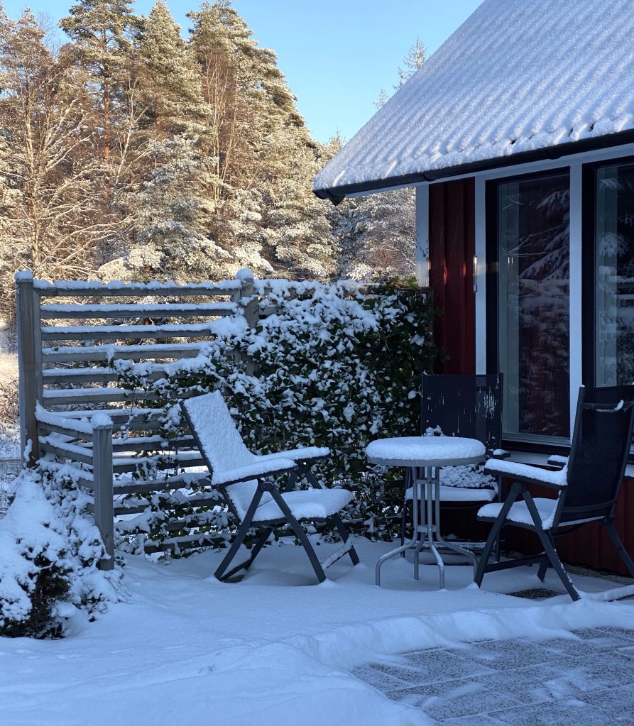 Visst är det kul att skaffa lite nytt och byta ut när det gamla börjar kännas tråkigt och slitet. Det var dags för nya stolar! (Det har det varit ganska länge, men vi har inte hittat några bra). Det har vi gjort nu. Faktiskt precis lika som vi har i vårt uterum. De är väldigt sköna. Bordet vill jag gärna behålla, men det är inte helt bekvämt det heller. Hur kan ett bord vara obekvämt, kanske ni undrar. Jo, för det första är det lite för högt, sedan är det en ”typ” bräda utmed kanterna, under bordet som gör att man inte kan sitta med det ena benet över det andra (som jag gärna gör). Kanske kan vi sänka benen och såga ut ett valv i brädorna under bordet. Men det kan bli problem…. Bordet är av gammal ek och det är inte det lättaste att såga i. Jag tycker att vårt bord är så fint. Gammalt och fint.