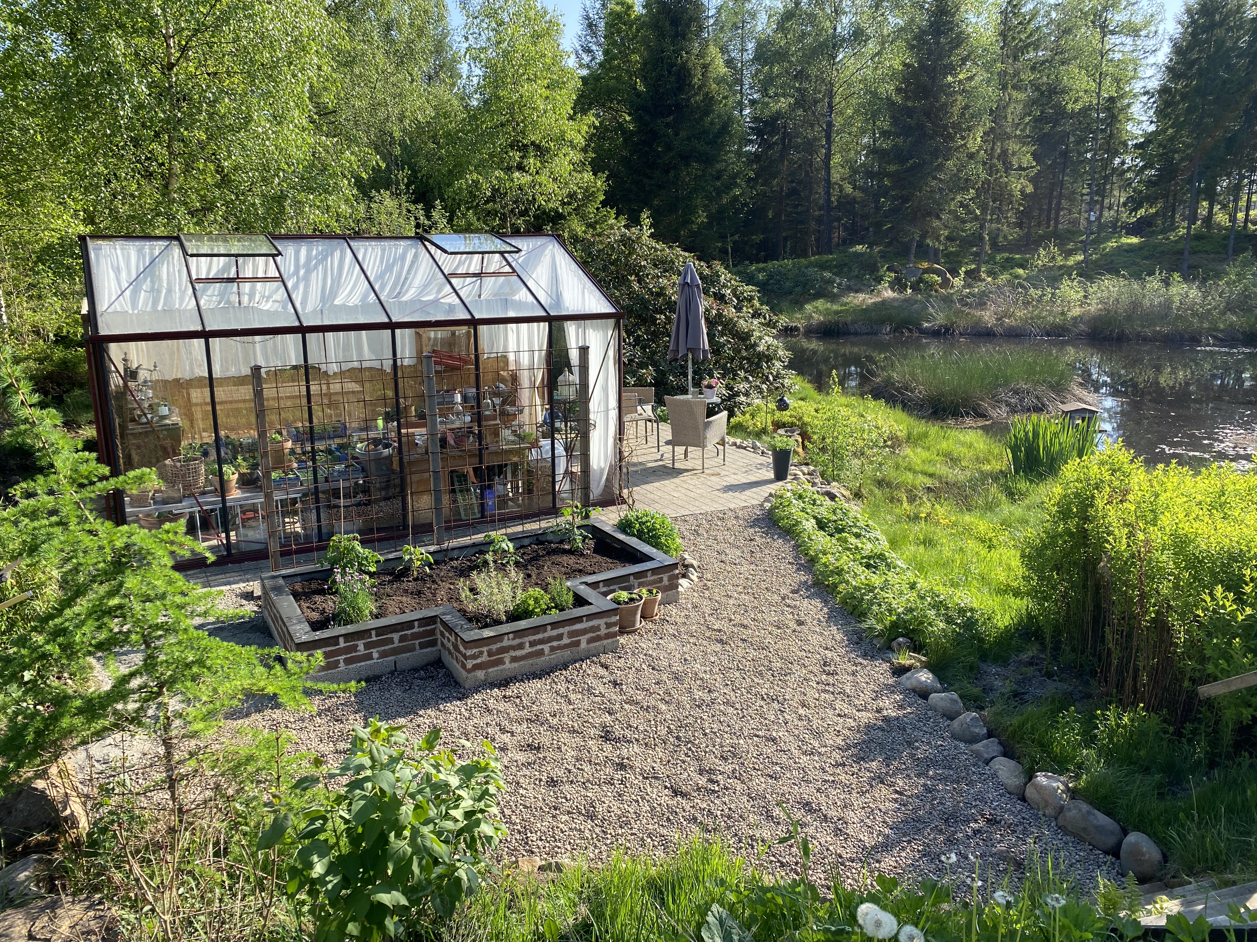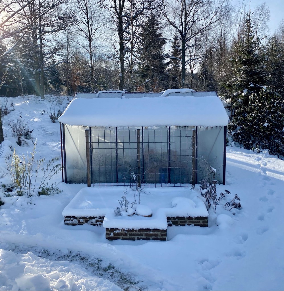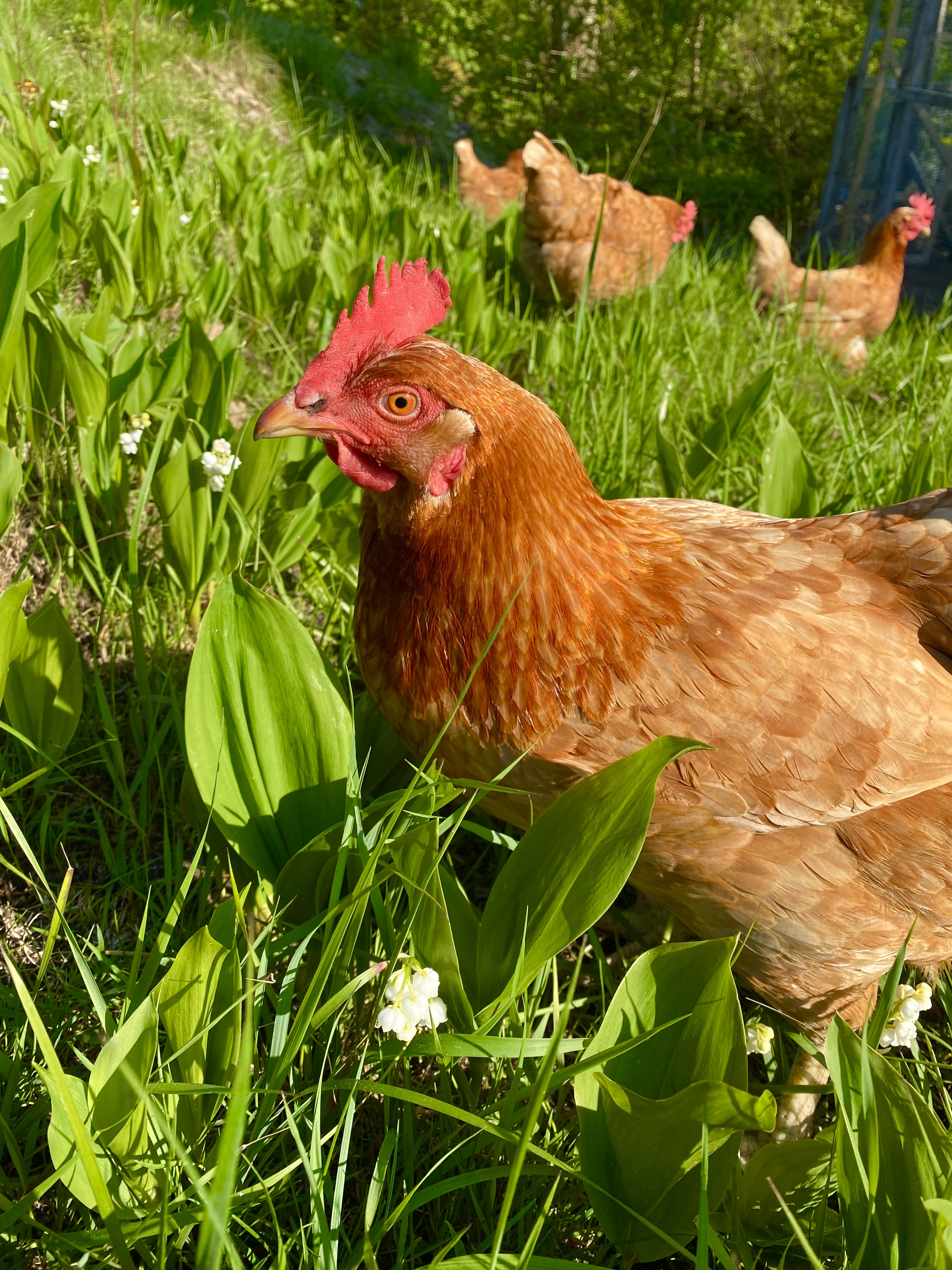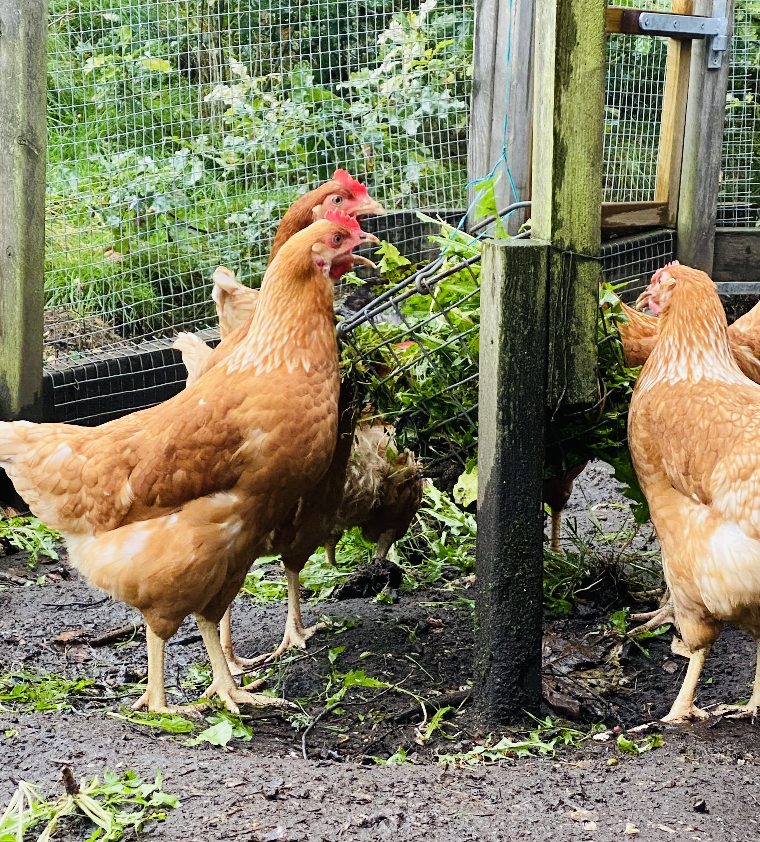 Vi vågar inte släppa ut dem i inhägnaden än, för de svåra att locka till sig och är inte tama alls. Snart kommer de att veta att ”jag = god mat”. Då kommer de! Idag plockade jag en hel spann med maskrosblad och äpplen till dem. Då blev det kalas!