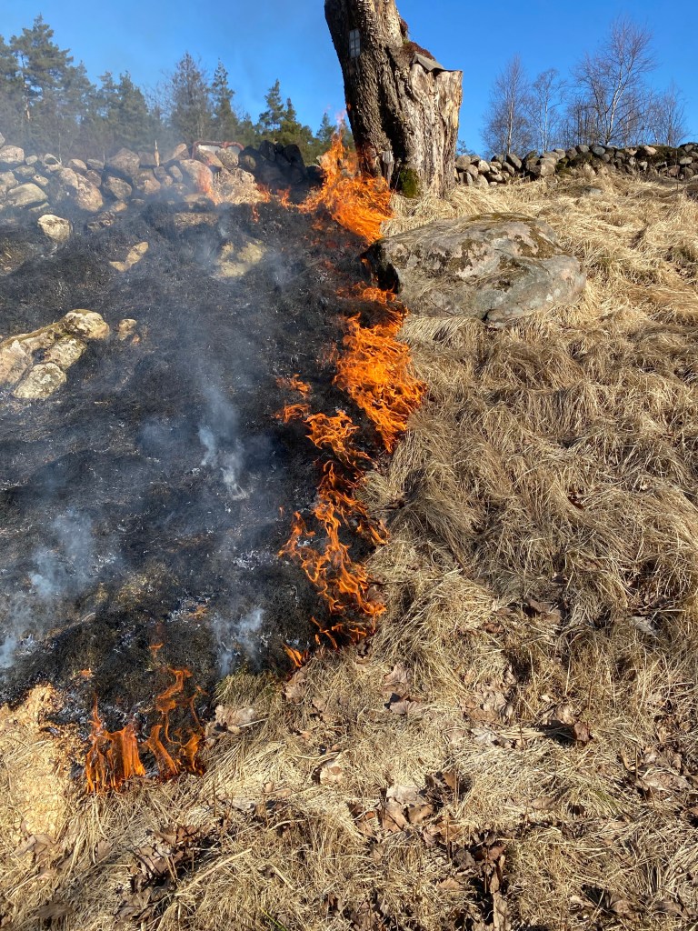 När det är färfigt, måste vi lunta bort allt gammalt fjolårsgräs. Förra helgen var det dags. Med en full ask tändstickor tuttade jag fyr på gräset. Vet inte om detta är en typisk ”Hallands-grej” att lunta, men det blir så fint och man luktar så mycket rök!! Men Ronny gick med vattenslangen, för vi vill inte ha skogsbrand!