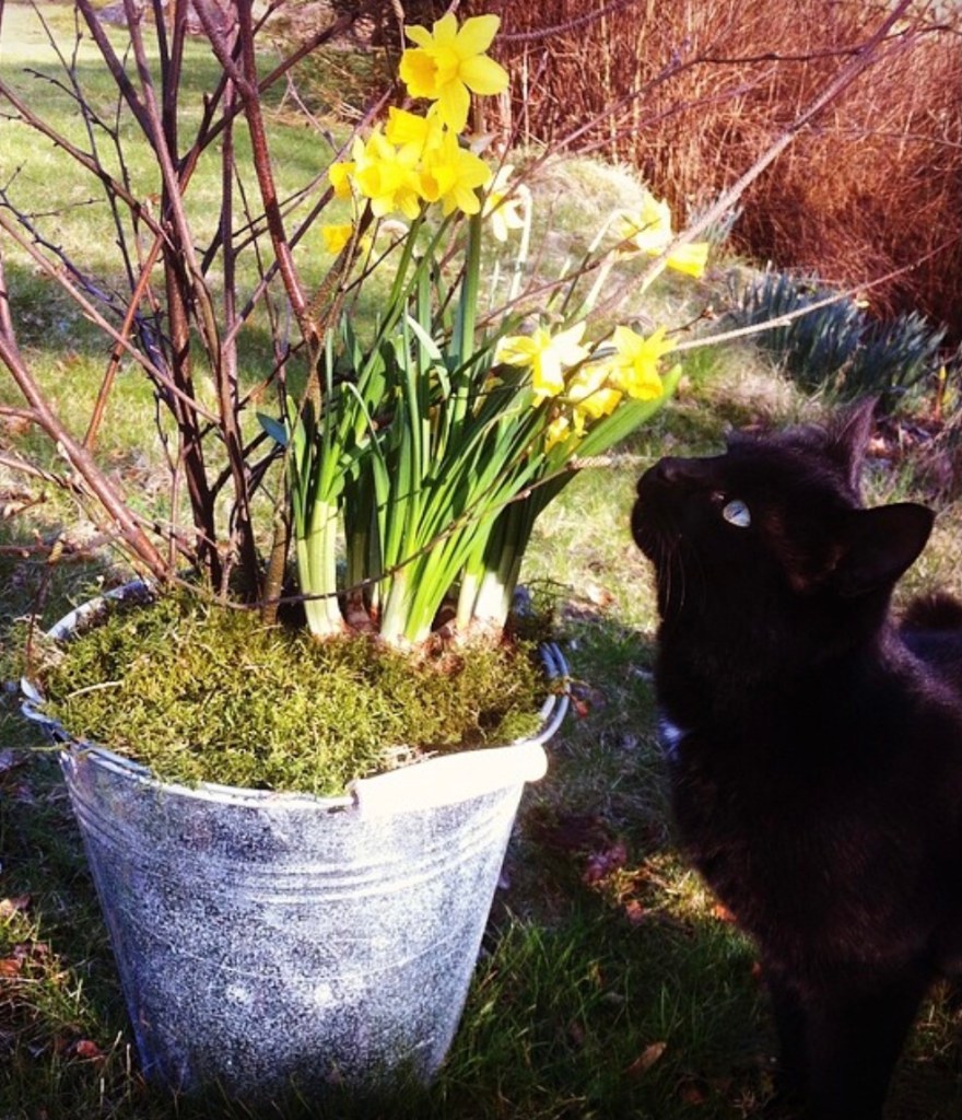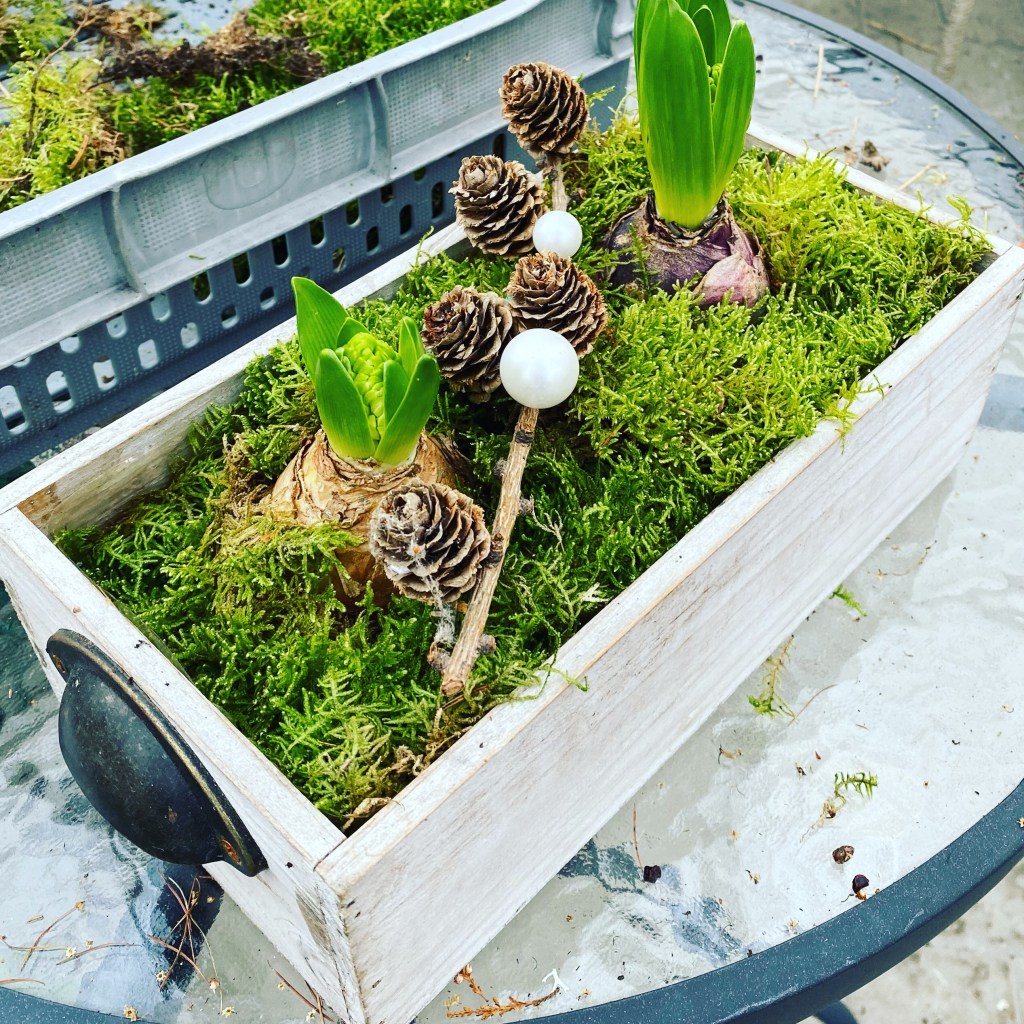 I lördags köpte vi några hyacinter – en av mina favoritblommor. Helst ska de inte växa så fort och mycket. De är så fina när de är små, innan de börjar blomma. De doftar så gott. Men sedan blir de för långa och kröker sig över bordet, då får man köpa nya. I växthuset hade jag redan samlat mossa, så det var inte svårt att få till en liten plantering.