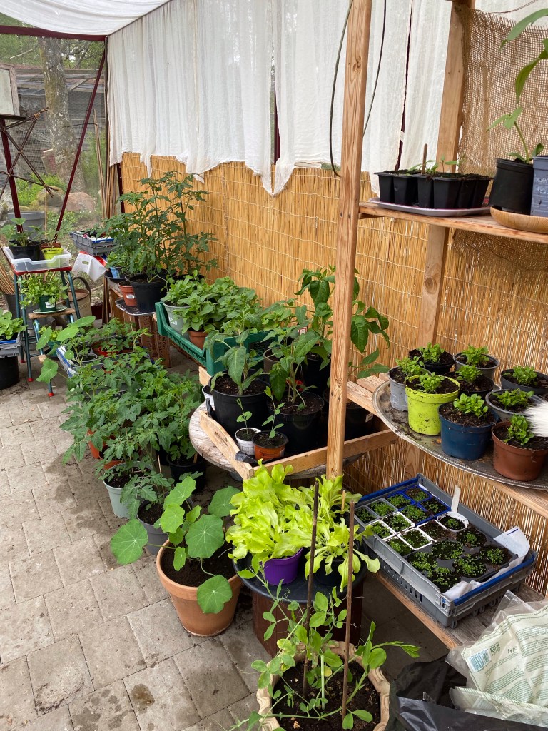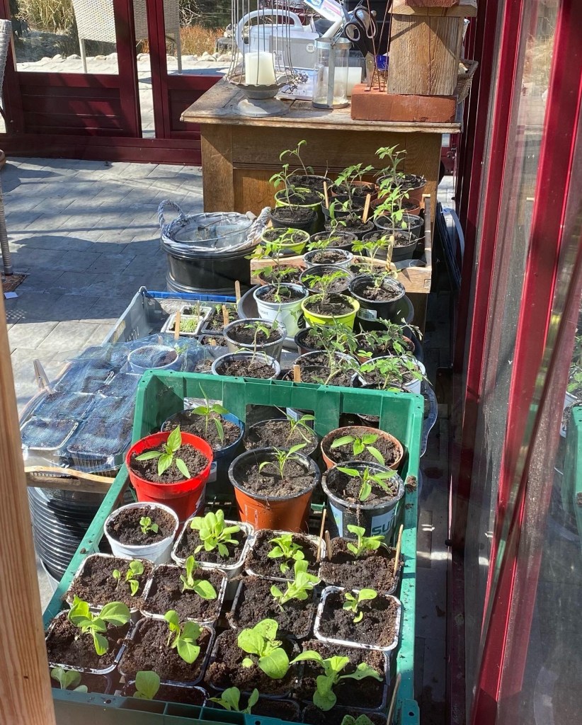 I växthuset spirar små plantor. Varje år ändrar vi på något både med inredningen och med vad som ska växa. Första året med växthuset ville jag att det både skulle vara en vacker plats att sitta på och runtomkring växtlighet. Jag inredde med äkta matta, gamla möbler och massor av ljus och pynt. I år är det tvärt om som gäller. Ut med allt onödigt krafs – här ska det odlas!