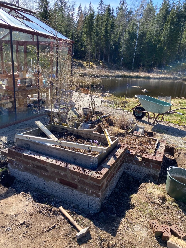 Även utanför växthuset förbereder vi med nya pallkragar. Ronny anlägger murade pallkragar! Fördelen är att de inte murknar, är mycket stadigare och blir inte fula. Detta blir superbra och snyggt! Är lite svåra att flytta, men jag tror nog att de fått en bra plats.