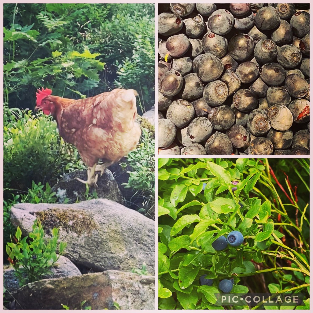 En annan växtlighet som jag gillar, och som nu börjar mogna är blåbären. Idag plockade vi våra första decilitrar – jag och hönsen 😂 De gillar också blåbär och de plockar de med och äter upp direkt.