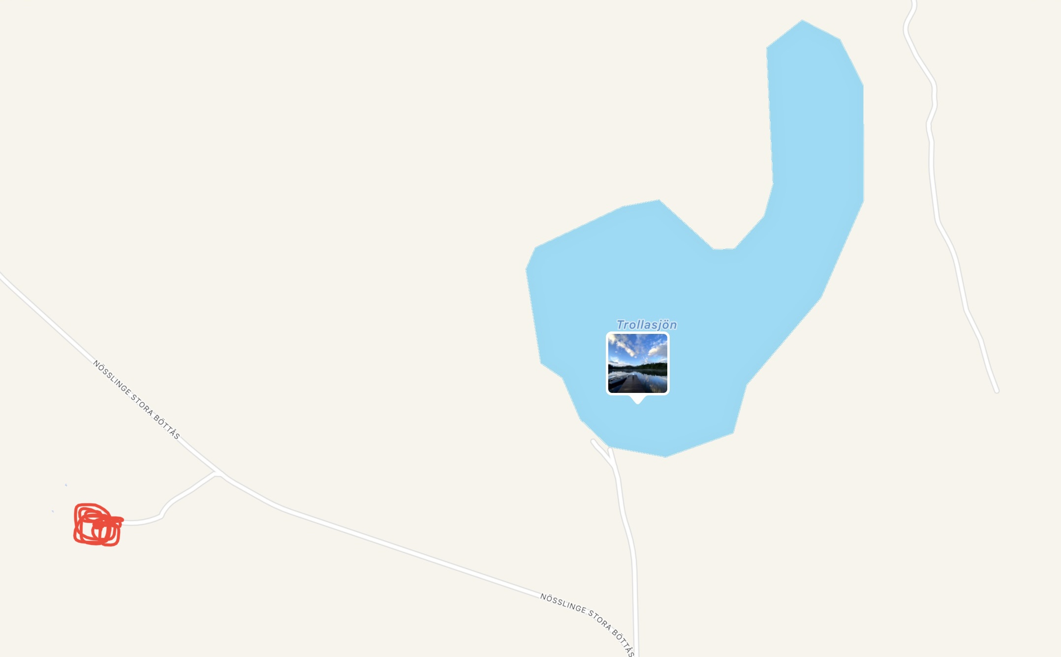 Till vår närmaste lilla sjö, kan man gå. Det tar inte ens 10 minuter. Nedanför har ni en bild på sjön. Den röda pricken är Slamrekullen. Där finns gädda och abborre och kanske någon mört. Man kan bada där också, men då får man inte vara känslig för ”gegga” eller fiskar…..