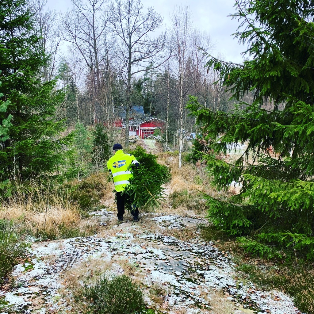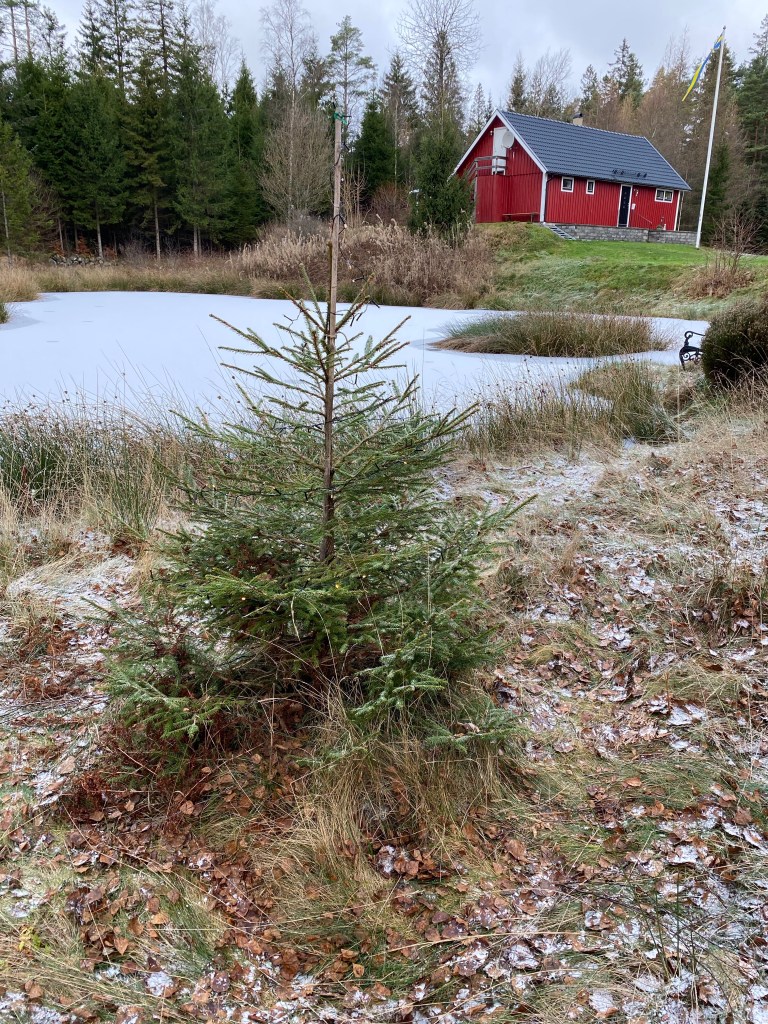 I går sågade vi den första julgranen, den ska till min moster i Falkenberg. Jag passade också på att sätta en slinga i en liten gran på andra sidan dammen. Den var lite kort, men jag förlängde toppen med en pinne. Det är ändå ingen som ser det.