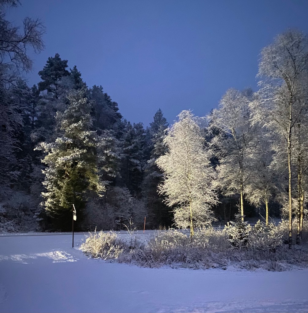 Jag gillar att sätta ljus i granar som växer. Det blir lite olika granar med ljus i, varje år. Efter ett tag blir granarna för stora och höga, då måste jag leta upp en annan.