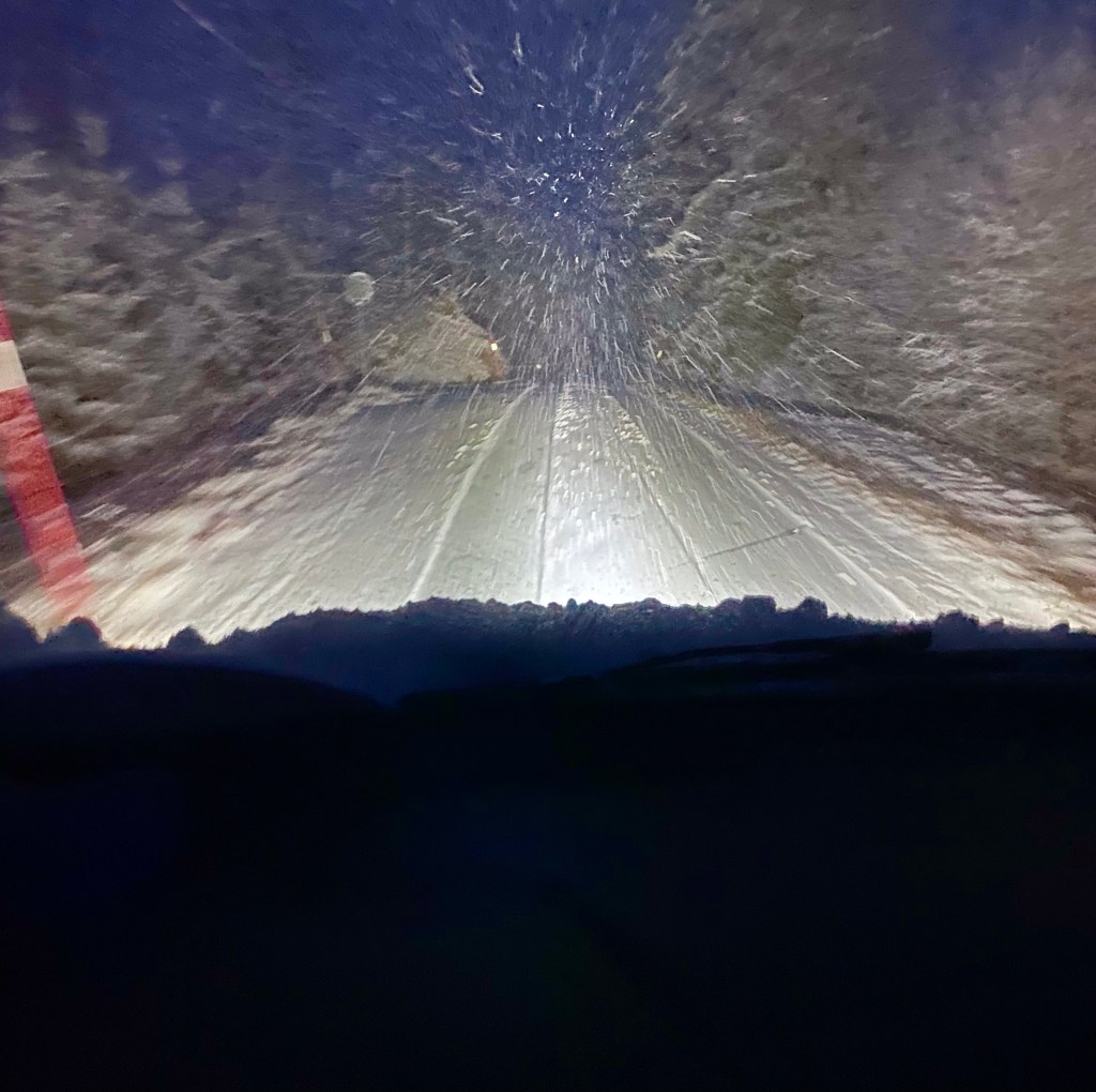 Oj! Vad det snöade i morse. Ibland kan det ju regna så mycket att man inte kan se vägen, idag var det så med snön. Då är det bra med snöpinnarna som lyser upp med sina reflexer.