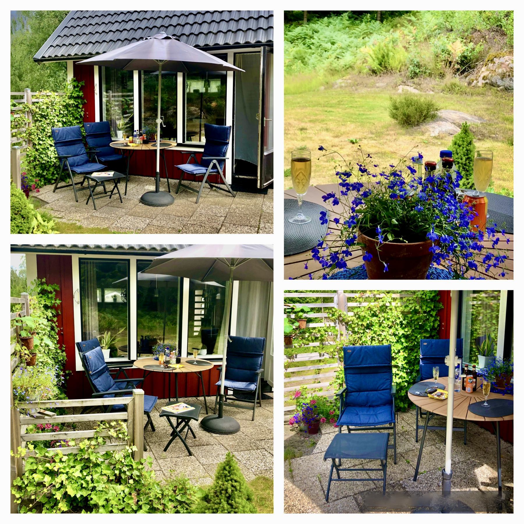 För några veckor sedan köpte vi ett nytt bord till stugans lilla terrass. Ett runt bord. Jag gillar runda bord. Det blev superfint och idag ”stylade” jag lite för att man riktigt ska se hur mysigt därkan bli med dynor och dricka och den lilla ”kub-spelaren” med melodikrysset 😉
