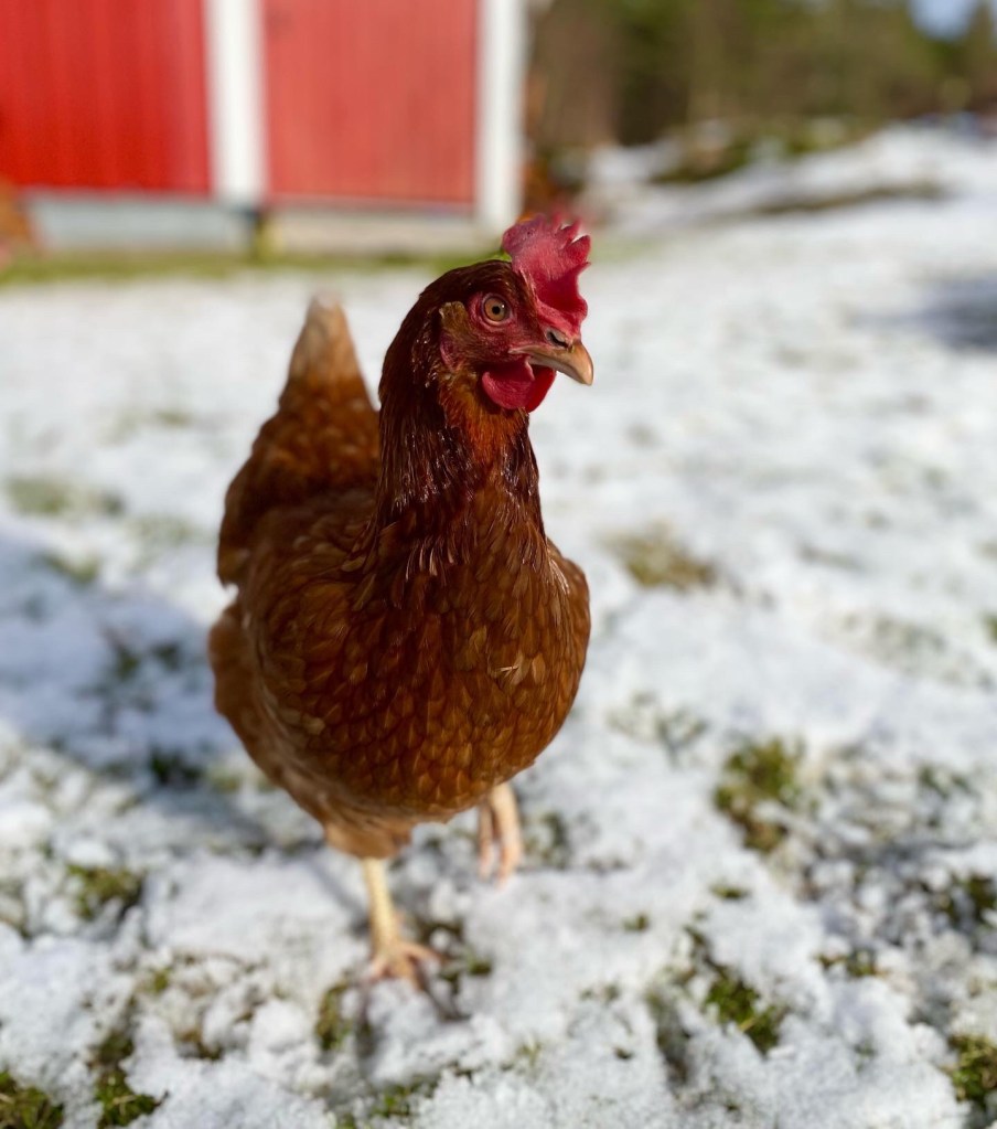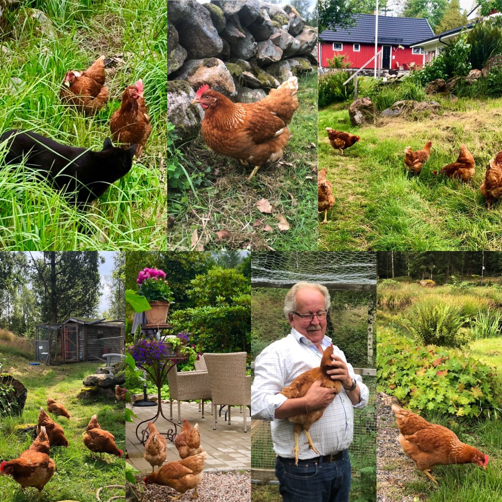 Många av hönsen har favoritplatser som de genast springer till. Har ni sett en höna springa? Man kan inte låta bli att skratta! 🤣 Flyga kan de faktiskt också. Inte långt, men om de tar sats från stenmuren, så segelflyger de säkert 10 meter. Det är inte så graciöst, och de ”kackelskriker” under tiden, så det liknar mest ett bombanfall! Man får se upp. 8 bruna, fina, goda ägg får vi varje dag ❤️