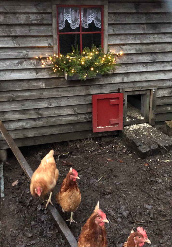 Nu är ju kransen uppsatt, så jag tänkte att jag lika gärna kan fortsätta pynta. Hönsens fula blomlåda måste ju bli fin och ”julig”. Lite granris och en ljusslinga gjorde det! Om de bryr sig? Det tror jag nog. De ska också ha det fint och mysigt. Är så tacksam över deras 8 ägg som de levererar varje dag.